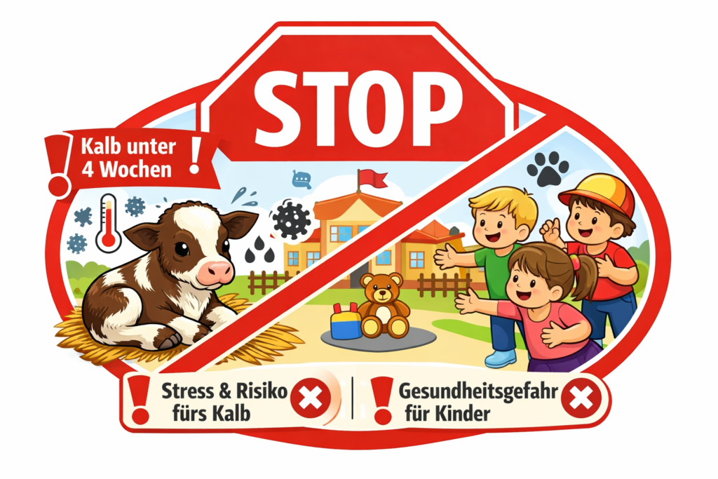 - Zoonosen/Keime: Kälber können (auch ohne sichtbar krank zu sein) Keime ausscheiden, die für Kinder relevant sind.